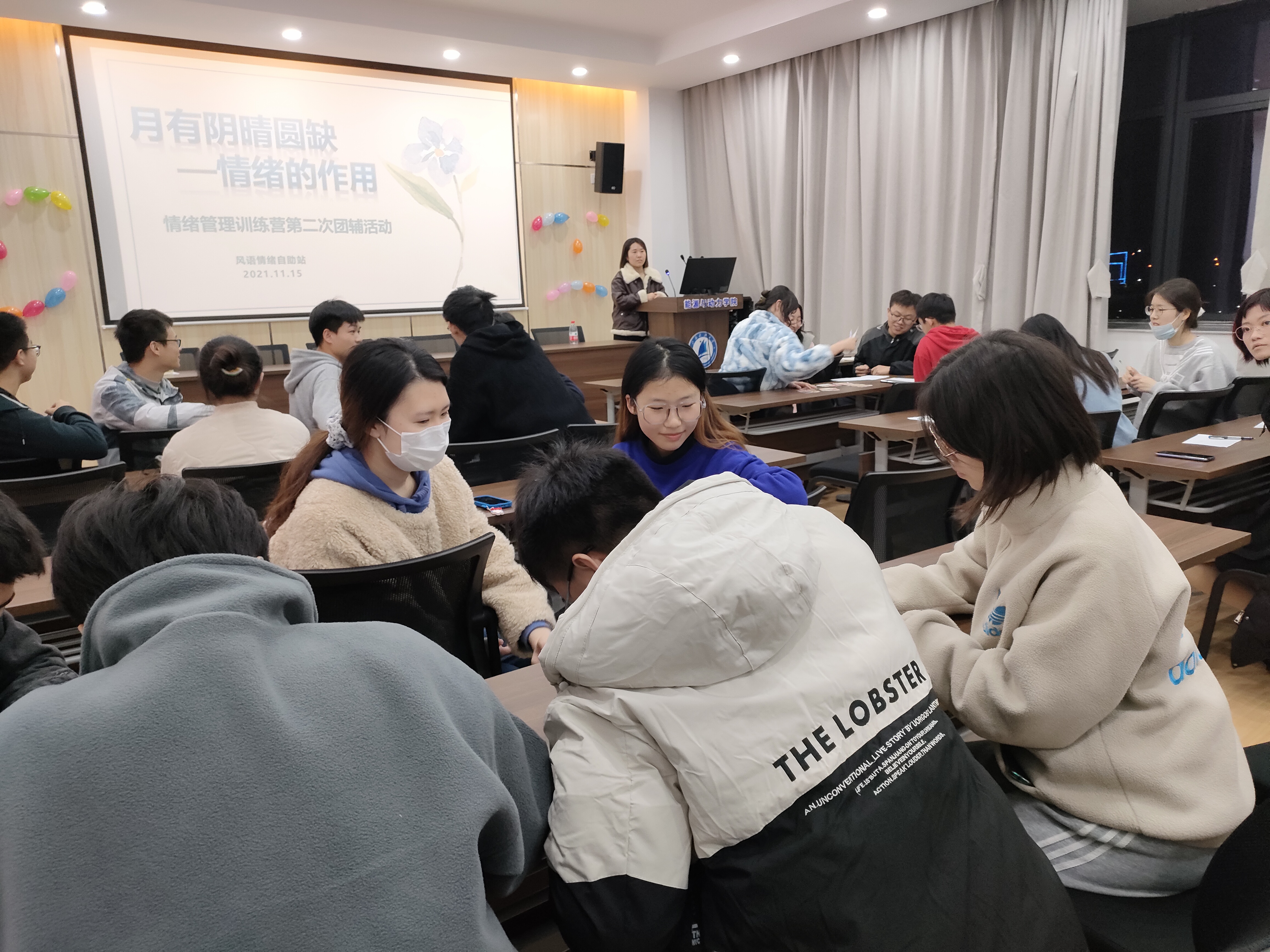 情绪贯穿于我们的学习与生活,并产生着不同的影响。为了帮助同学们检省自己的情绪,了解自己的主导情绪,引导大家体验快乐情绪,11月15日,由太阳集团tyc151cc和电子信息学院合办的“风语情绪自助站”举办了情绪管理训练营第二次团辅活动——“月有阴晴圆缺——情绪的作用”。